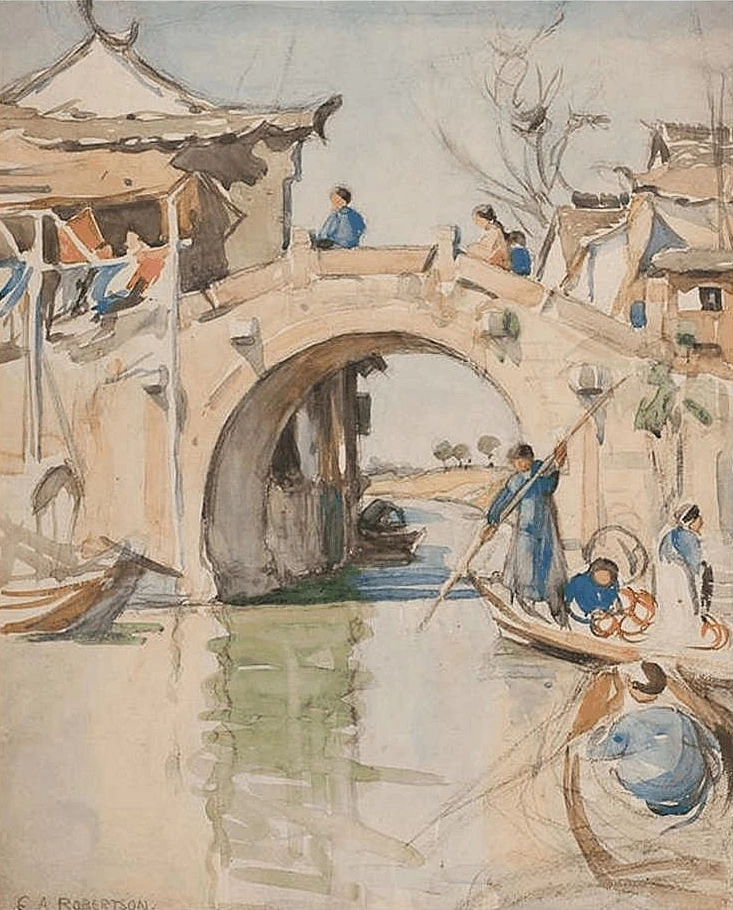 Eleanor first exhibited at the Glasgow Institute in 1909, but the outbreak of the First World War in 1914 allowed little opportunity for painting, and she became a Voluntary Aid Detachment nurse at Craigleith Hospital near Edinburgh.[1] She married Dr Robert Cecil Robertson in 1922, and on his appointment to the Shanghai Municipal Council as a public health official, the couple moved to China in 1925.[2][3]