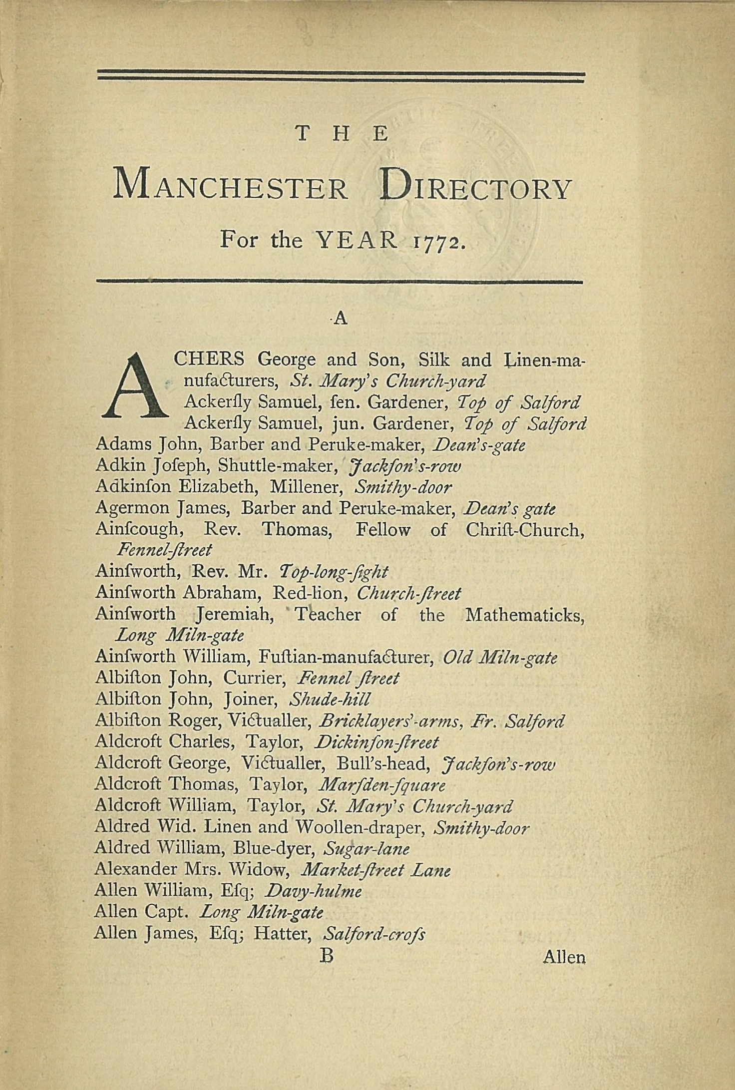 Elizabeth produced the first trade directory of Manchester and Salford, published in 1772 and revised and reissued in 1773 and 1781. She also invested in two local newspapers – the Manchester Mercury and thePrescott’s Journal – and wrote a book on midwifery with Charles White